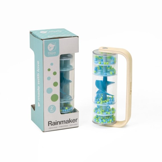 Drewniano-Plastikowa Niebieska Deszczownica z Kuleczkami marki CLASSIC WORLD z przesypującymi się kuleczkami dającymi kojący dźwięk padającego deszczu.Potrząśnij, obróć i obróć, zobacz jak koraliki spadną z góry na dół. Jednym szybkim chwytem możesz przemienić tę zabawkę w grzechotkę, która obraca się o 360 stopni. Świetna propozycja dla rozwoju czuciowego. Idealny rekwizyt do zajęć z rytmiki!
