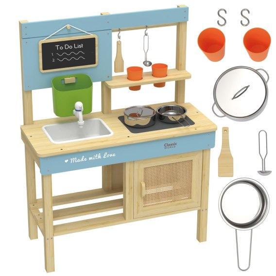 Naśladowanie dorosłych to dla dzieci fantastyczna zabawa! Drewniana kuchnia błotna marki Classic World to idealna zabawka dla małych miłośników gotowania na świeżym powietrzu! Zaprojektowana z dbałością o szczegóły, wykonana z naturalnego certyfikowanego drewna, z uroczymi pastelowymi akcentami - stworzona, by rozwijać kreatywność, zdolności manualne i wyobraźnię dziecka poprzez zabawę w dorosłe życie. Zabawka może służyć smykowi do zabawy w restaurację lub sklep. Można ją wykorzystywać na mnóstwo różnych sposobów, a kreatywnej rozrywce nie ma końca! Zbiornik z kranikiem umożliwia obieg wody, dzięki czemu dziecko może bawić się w gotowanie, mycie naczyń lub mieszać błotko.