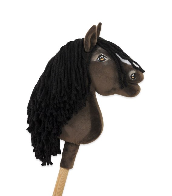 Ciemnobrązowy konik Hobby Horse maści ciemnogniadej, z czarną długą miękką grzywą idealną do tworzenia pięknych fryzur. Biała strzałka na pysku.