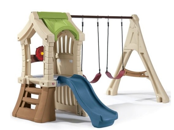- Plac zabaw zawiera: drabinkę i zjeżdżalnię o długości 130 cm, dwie huśtawki, koło sterowne.