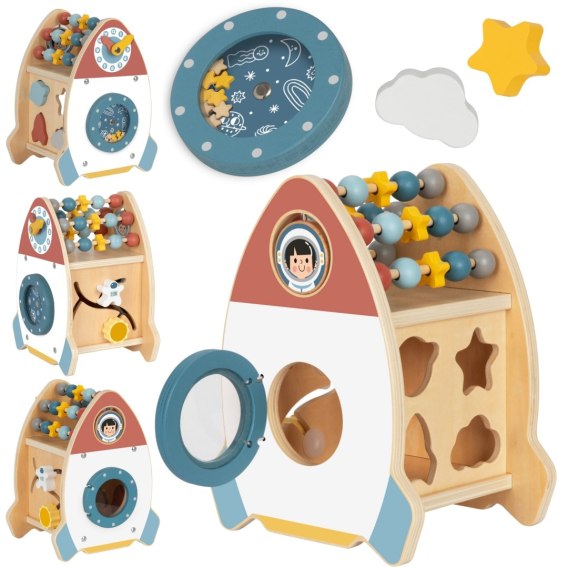 • - posiada 6 aktywności: przesuwanie i obracanie koralików, sortowanie kształtów, ustawiane wskazówek zegara, obracanie galaktyki, obracanie kosmonauty, otwieranie i zamykanie rakiety.