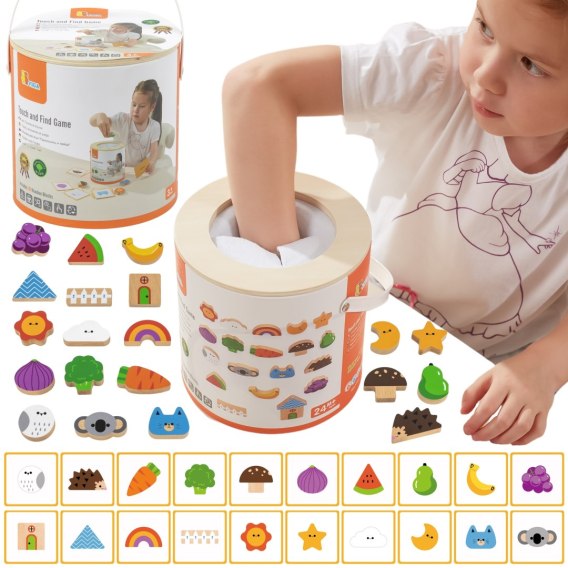 - zestaw zawiera 20 klocków, 20 kart oraz opakowanie z dziurką przez, które dziecko bawi się w "dotknij i poczuj",