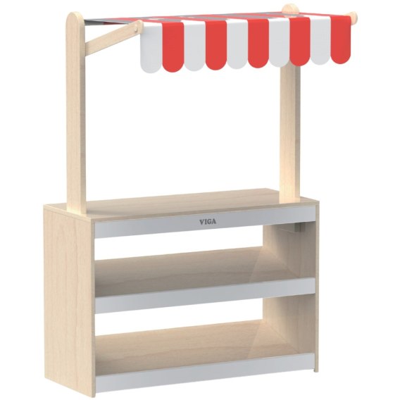 ✔️ Zabawka od 3 roku życia ✔️ Wykonany z solidnego drewna pomalowany nietoksycznymi farbami ✔️ Wyposażony w charakterystyczny czerwono-biały daszek w paski ✔️ Posiada dwie półki do ekspozycji produktów ✔️ Idealny do kreatywnej zabawy w sklep lub stoisko targowe ✔️ Solidna konstrukcja zapewniająca trwałość i bezpieczeństwo