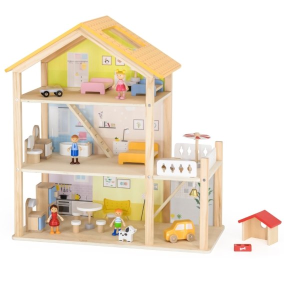 Duży drewniany domek od marki Viga z serii PolarB to zabawka wykonana z naturalnych materiałów wysokiej jakości, która zachwyci twoje dziecko! Domek jest w pełni umeblowany i wyposażony w niezbędne akcesoria. Twoje dziecko znajdzie tu wszystko, czego potrzebuje do stworzenia własnego, bajkowego świata: kuchnię, salon, łazienkę, przytulną sypialnię, pokoik dziecięcy oraz garaż i balkon a nawet domek dla pieska! Każdy pokój został starannie zaprojektowany i wyposażony w mebelki oraz dodatki. Zestaw zachęca do kreatywnej zabawy, rozwija wyobraźnię i umiejętności społeczne.