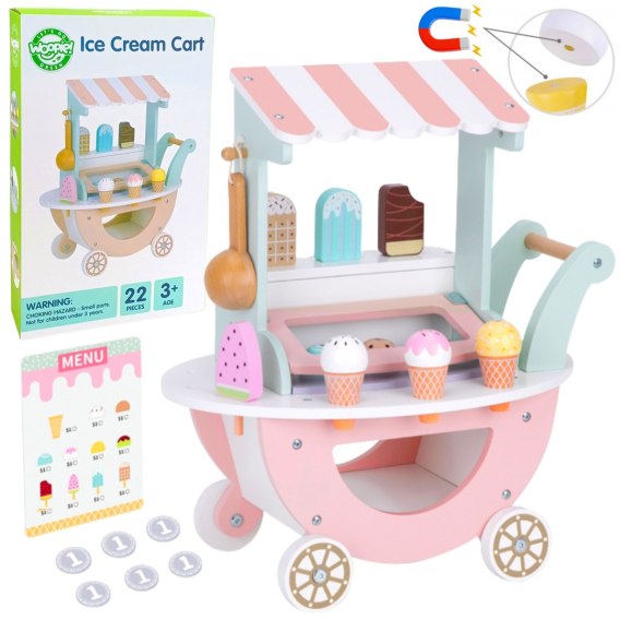 - Bogaty zestaw akcesoriów: Zawiera lody na patyku, wafelki, kolorowe gałki, łyżkę do lodów, menu oraz drewniane monety - łącznie 27 elementów