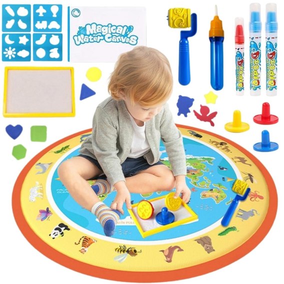 Magiczna mata wodna Magical Water Canvas od marki Woopie to kreatywna i edukacyjna zabawka, która zachwyci każde dziecko. Dzięki specjalnym pisakom wodnym malowanie jest całkowicie bezpieczne - wystarczy woda, aby tworzyć niesamowite rysunki i wzory. Kolorowa mapa świata z zaznaczonymi zwierzętami sprawia, że zabawa staje się także okazją do nauki geografii i poznawania przyrody. W zestawie znajdują się liczne akcesoria: stempelki, szablony, wałek, pisaki i gąbka - które urozmaicają twórczość. To idealny pomysł na prezent, który rozwija wyobraźnię i gwarantuje godziny radosnej zabawy bez bałaganu.