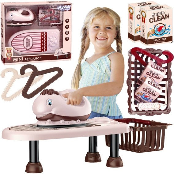 Zestaw do Prasowania od marki WOOPIE dostarczy dziecku mnóstwo zabawy dzięki możliwości wcielania się w rolę dorosłych . W zestawie znajdziemy żelazko w kształcie wielorybka, deskę do prasowania, kosz na pranie, dwa wieszaki oraz dwa opakowania proszku na pranie. Żelazko jest zabawką bezpieczną dla dzieci, ponieważ nie nagrzewa się. Zostało ono wyposażona w wiele funkcji, które urozmaicą zabawę: świecącą lampkę LED oraz efekty dźwiękowe. Zabawka działa także bez napełniania wodą. Jest to doskonały zestaw dla dzieci, które uwielbiają naśladować rodziców podczas codziennych czynności.