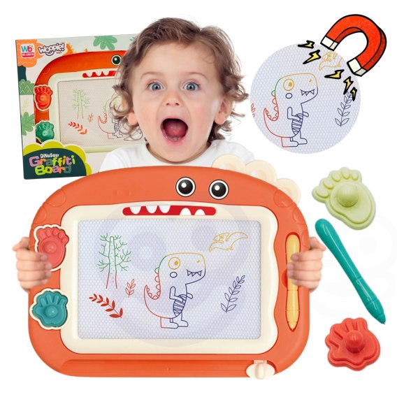 Tablica Magnetyczna Znikopis od marki Woopie to innowacyjna zabawka edukacyjna, która łączy naukę i zabawę w wyjątkowo kreatywny sposób. Wyróżnia się oryginalnym designem - sympatyczny dinozaur o dużych oczach zachęca dzieci do aktywnej zabawy. Tablica umożliwia rysowanie bez bałaganu, nie wymaga papieru, tuszu ani farb. To idealne rozwiązanie dla rodziców, którzy cenią sobie czystość i wygodę, a dla dzieci - źródło niekończącej się frajdy! Kolorowa powierzchnia magnetyczna pozwala dzieciom tworzyć rysunki w różnych kolorach. Wystarczy przesunąć suwak, by jednym ruchem wyczyścić całą tablicę i rozpocząć zabawę od nowa. Dołączony pisak magnetyczny oraz dwie pieczątki w kształcie łapek dają mnóstwo możliwości do tworzenia zabawnych ilustracji i wzorów. Tablica magnetyczna to doskonałe narzędzie do rozwijania zdolności manualnych, wyobraźni i kreatywności. To także świetny sposób na wstęp do nauki pisania i rysowania kształtów. Wszystko to zamknięte w poręcznej, lekkiej i bezpiecznej formie, którą dziecko może zabrać ze sobą wszędzie - do przedszkola, na wakacje czy do dziadków.